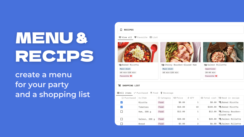 What's a party without food? In this section, you can create a menu for your party β fill in recipes, choose your favorites with friends, and create a shopping list.